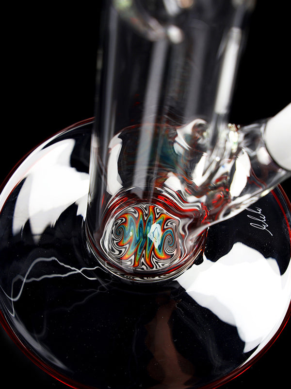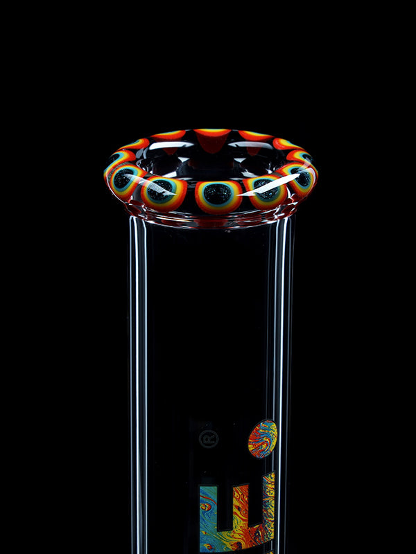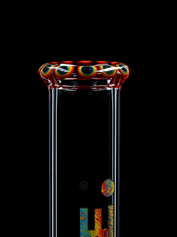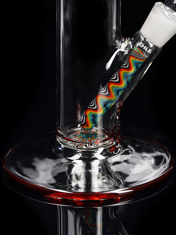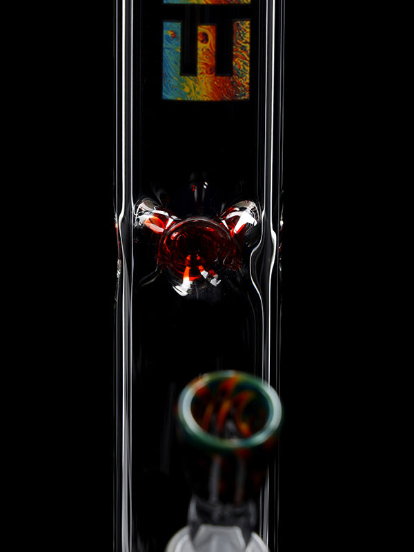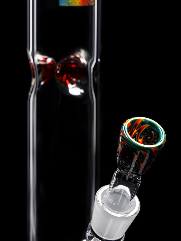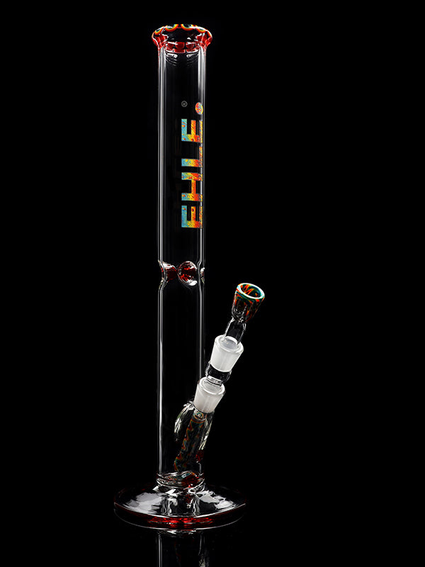 Standing 45 cm tall with a solid 5 mm wall thickness, this bong features a stable round base, a colored mouthpiece, a colored base, and a decorative color section in the bottom. The red ice pinches allow you to add ice cubes for noticeably cooler, smoother hits.