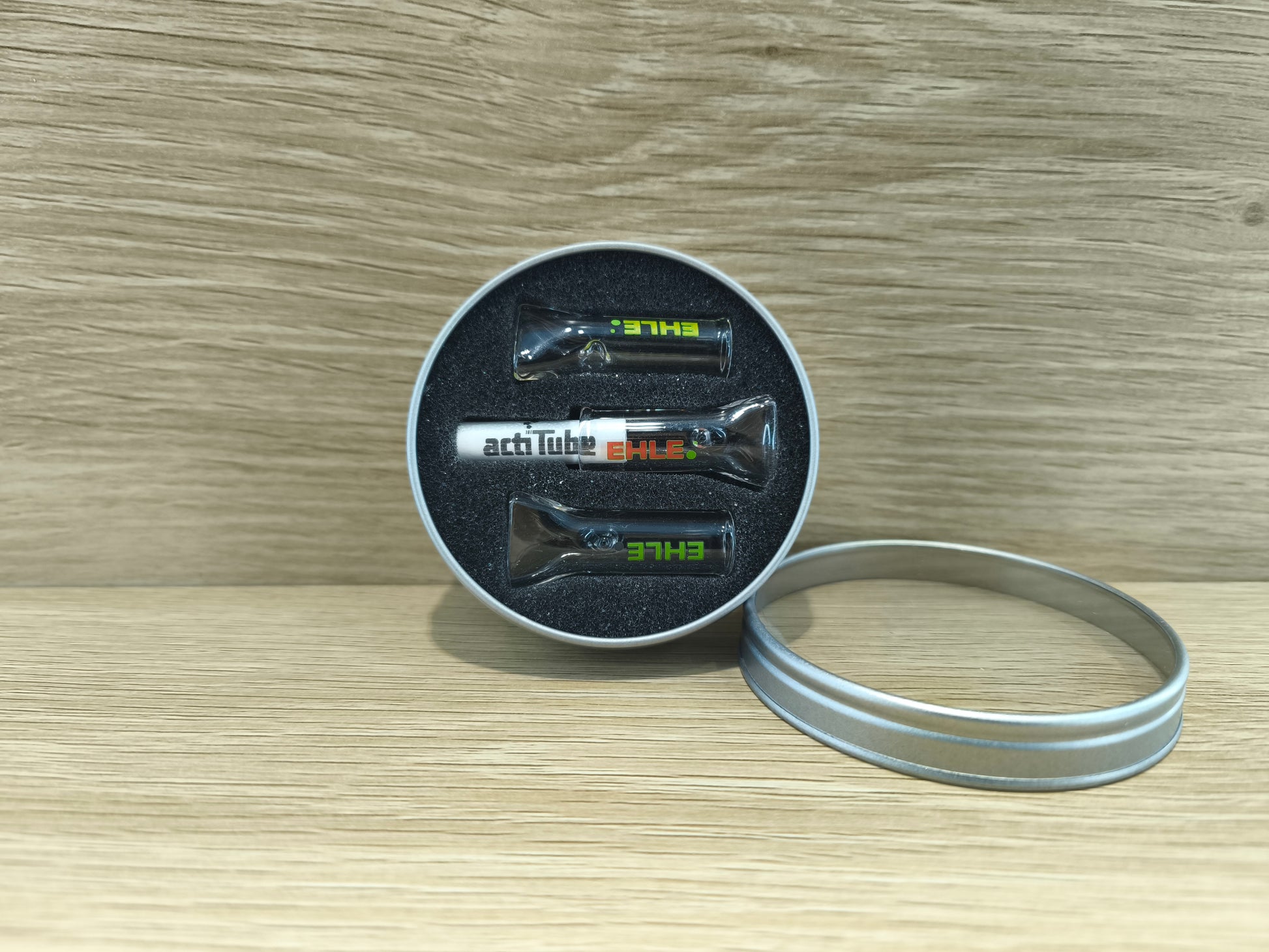 Upgrade your setup with the EHLE Glass Filter e.Tips for actiTube Slim, presented in a stylish 3-piece tin with protective foam for safe and elegant storage.